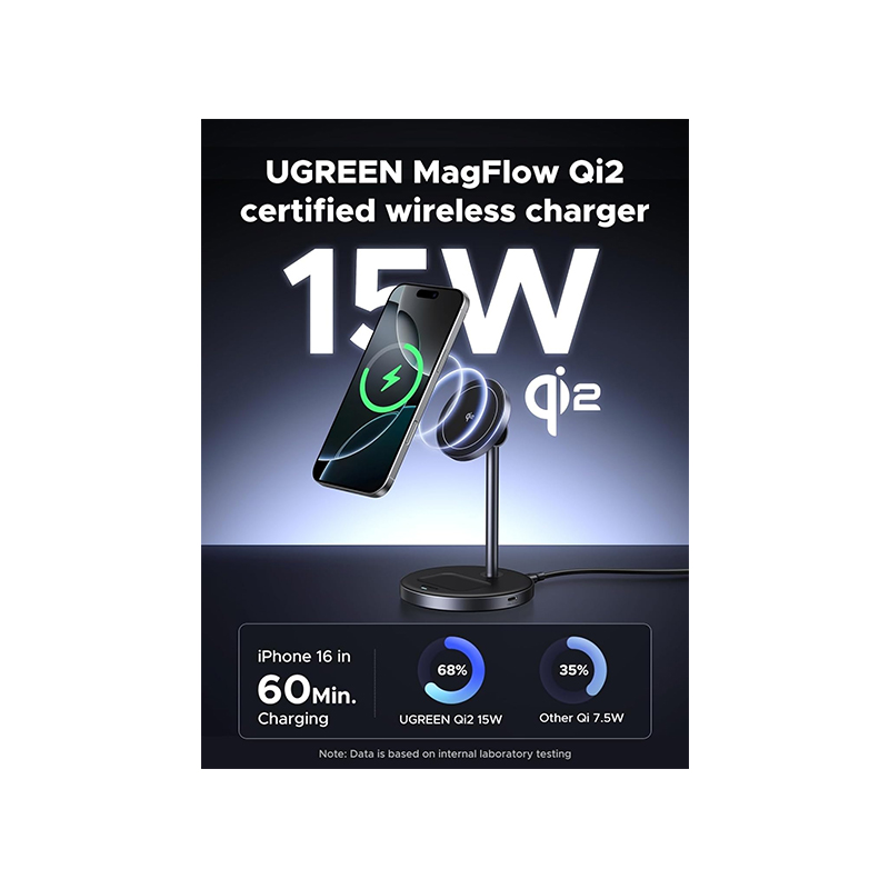 Dual Functionality Charger: Supports simultaneous wireless charging for iPhone and AirPods, while also reserving a C-port output. In one hour of charging, the Qi2 charger can charge an iPhone 16 up to 68%