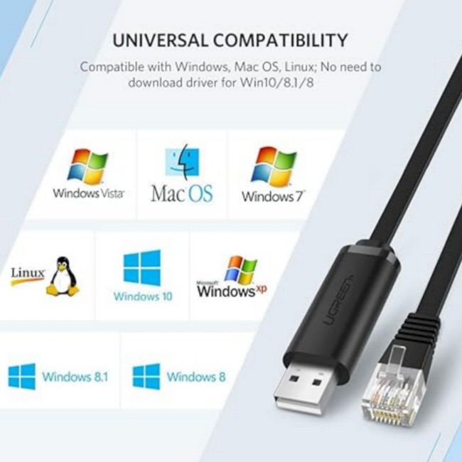 The UGREEN CM204 USB to RJ45 Console Cable is a reliable and efficient solution for configuring and managing network devices. Measuring 1.5 meters in length, this cable connects a USB Type-A port to an RJ45 console port, making it ideal for IT professionals working with routers, switches, and firewalls. It features a built-in FTDI FT232RL chipset for stable RS232 serial communication and offers plug-and-play compatibility with Windows, macOS, and Linux systems. Designed for durability and performance, the cable includes nickel-plated connectors and a robust PVC jacket.