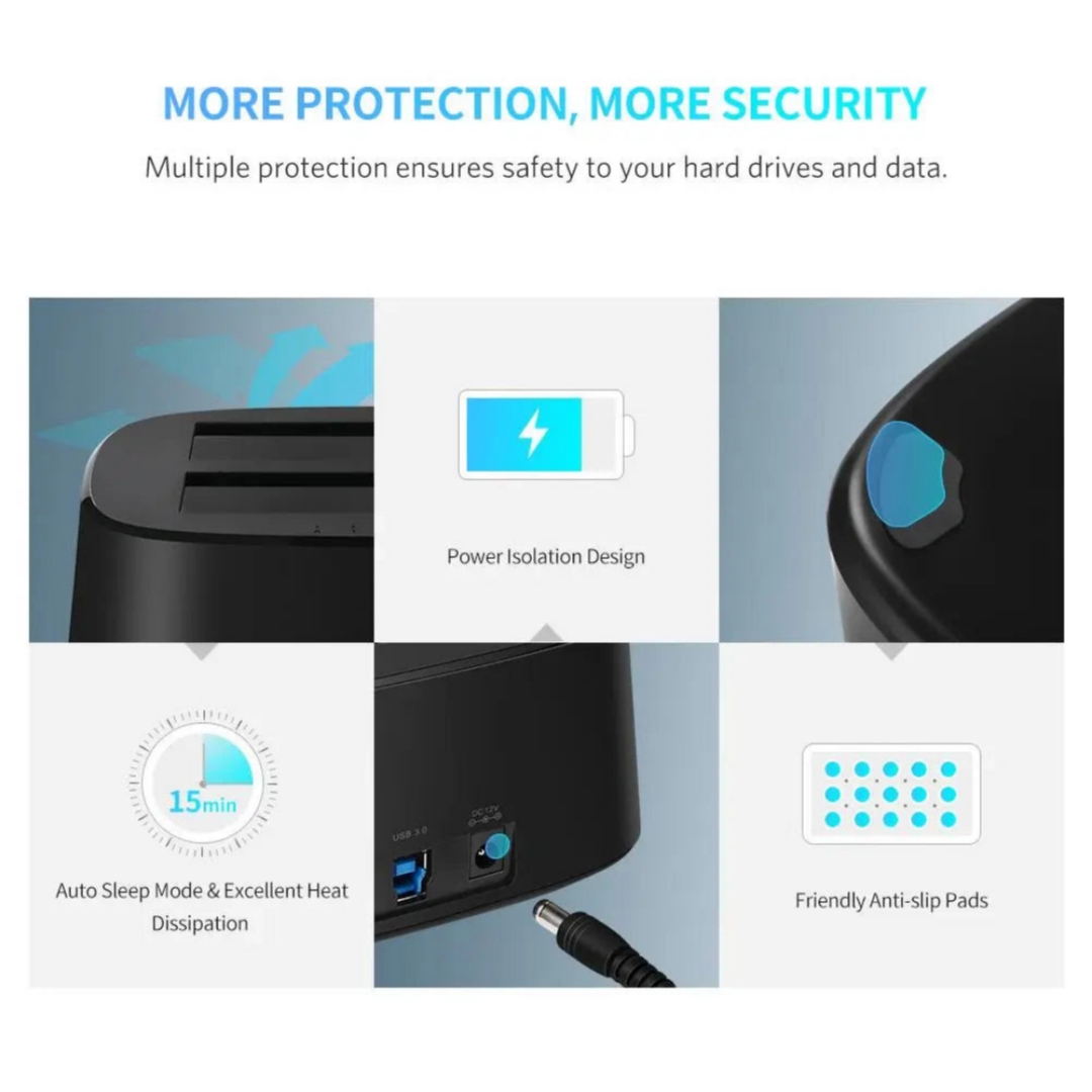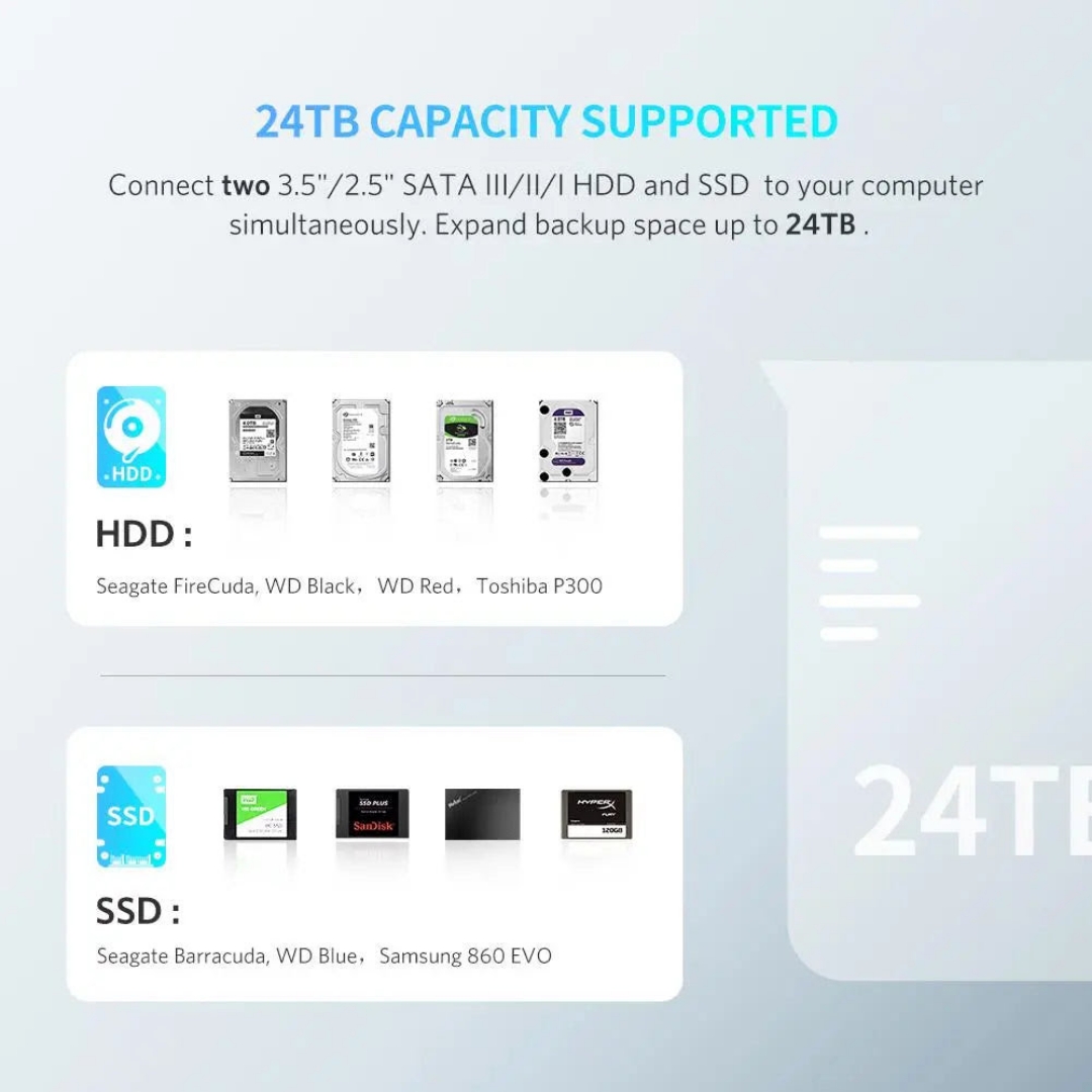 Dual-Bay Design: Supports two 2.5″ or 3.5″ SATA hard drives or SSDs, allowing for simultaneous access and data management.