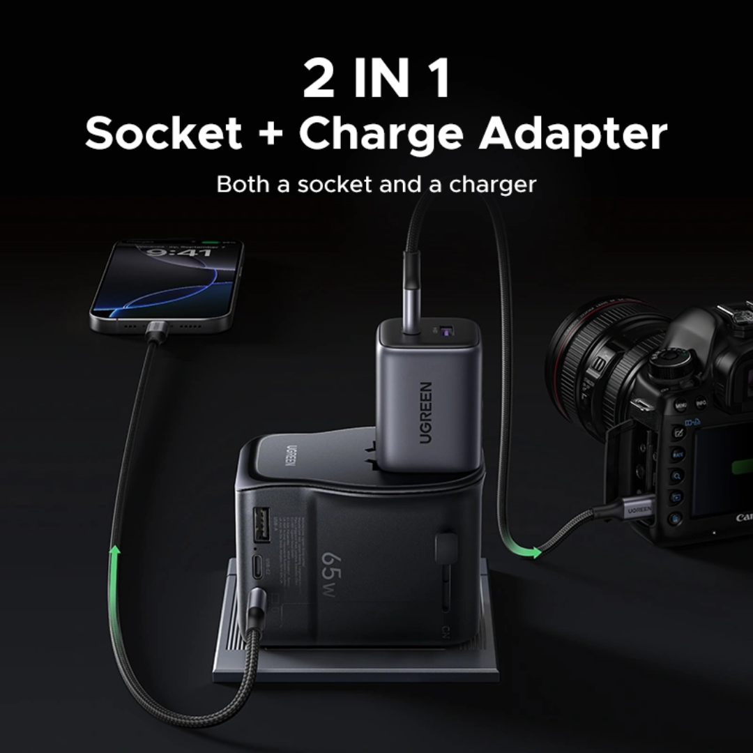 The UGREEN S550 is the ultimate all-in-one travel companion. This unique 2-in-1 adapter combines a standard AC outlet socket with three USB ports, letting you charge your laptop, phone, and tablet at the same time. The 65W USB-C port powers MacBook Air to 51% in 30 minutes, while interchangeable plugs adapt to over 90 countries. Weighing just 300 grams with advanced GaN technology, it stays compact and runs cool. Perfect for business travelers and adventurers who need one adapter for everything, everywhere.