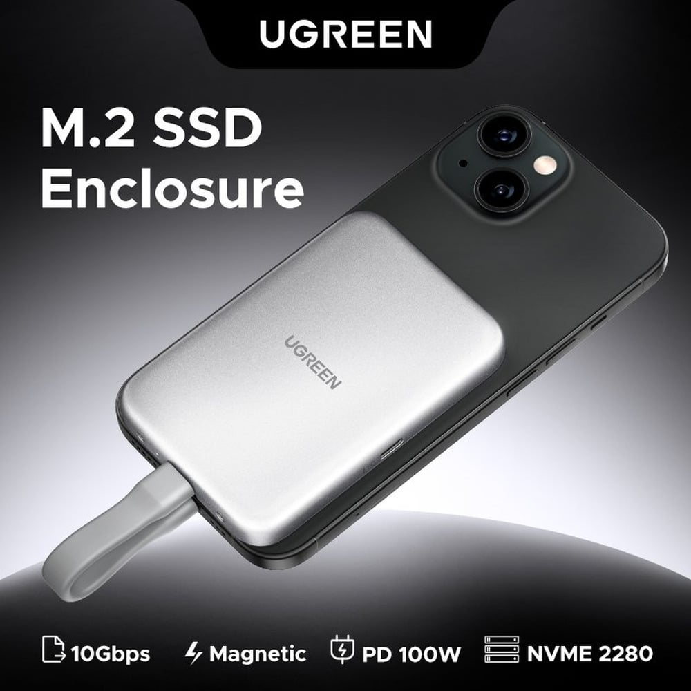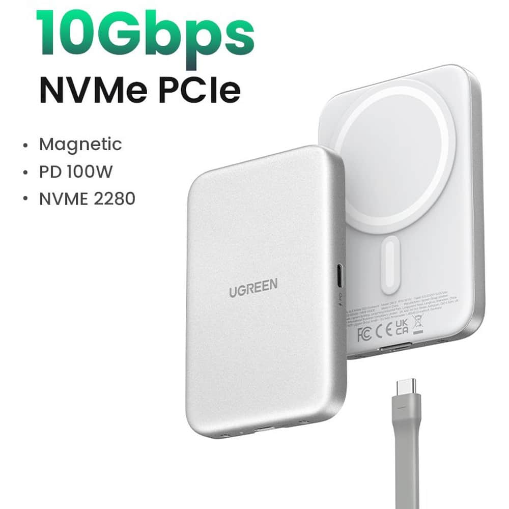 The UGREEN Magnetic M.2 NVMe SSD Enclosure (D619 / 55151) combines convenience with performance. It features a magnetic tool‑free design, allowing quick, snap‑on SSD installation without screws. Compatible with M Key and B+M Key NVMe SSDs (sizes 2230, 2242, 2260, and 2280), it delivers fast data transfer via USB‑C 3.2 Gen 2 at up to 10 Gbps, and includes a second USB‑C port for up to 100 W USB‑PD charging. The sleek aluminum alloy housing, paired with an included thermal pad, provides effective heat dissipation during heavy workloads. It is compatible across platforms—including iPhone 15/16 (MagSafe-friendly), Windows, macOS, Linux, Android, tablets, and gaming consoles