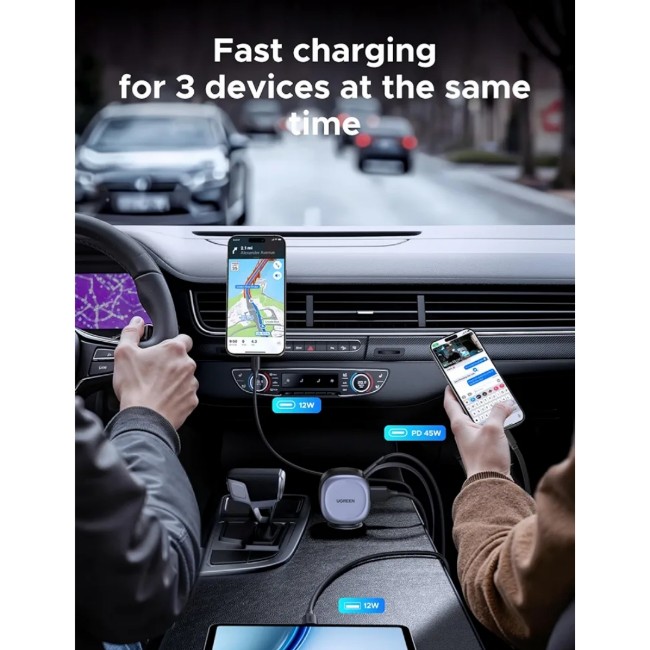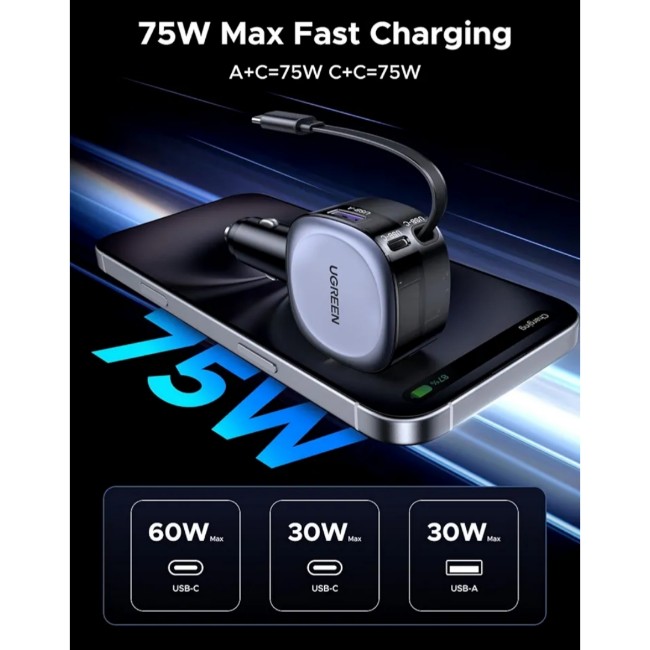 75W Fast Charging: This UGREEN car charger boasts a maximum total output of 75W. The retractable USB-C cable supports up to 60W output, while both the USB-C and USB-A ports can deliver a maximum of 30W, ensuring fast charging for your devices