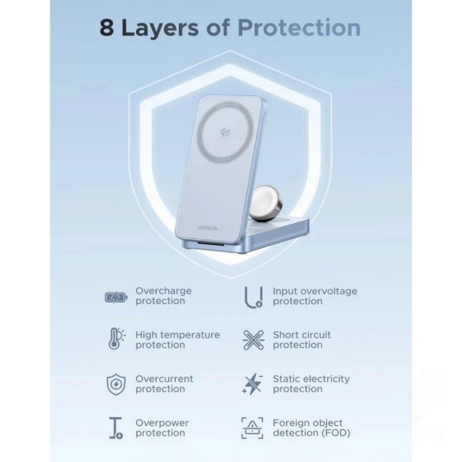The UGREEN MagFlow 3-in-1 Magnetic Wireless Charger is a premium all-in-one charging solution designed for users who rely on multiple Apple devices every day. Built with the latest Qi2 wireless charging technology, it allows you to charge your iPhone, AirPods, and Apple Watch simultaneously—all from a single, compact charger.