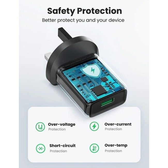 The UGREEN 18W USB Fast Charging Power Adapter with QC3.0 is a compact and reliable solution for efficient charging on the go. Equipped with Qualcomm QC 3.0 technology, this charger powers compatible devices up to 80% in just 35 minutes, making it 3x faster than conventional chargers. Backward-compatible with QC 2.0, Huawei FCP, and standard devices, it delivers a maximum output of 3A. Its durable, heat-resistant PC shell and built-in protections ensure safe charging every time, making it perfect for home, office, or travel use.