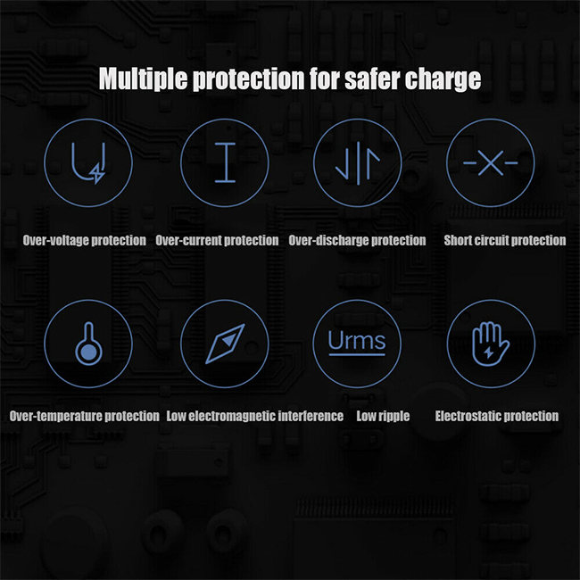 Multi-protection,?Over-voltage protection, over-current protection, short-circuit protection, over-temperature protection, electrostatic resistance and low electromagnetic interference.