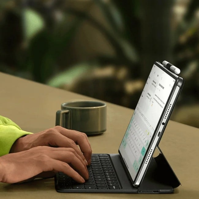 The sleek and luxurious Black PU material with a sophisticated textured design is minimalist, elegant and skin-friendly. The keyboard is durable and resistant to dirt, designed to resist fingerprints and oil stains. It is also equipped with a detachable pen holder at the top for easy storage.